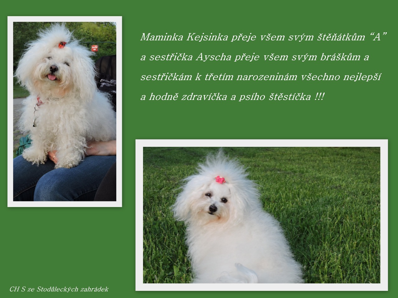 Dne 14.6.2016 už to budou tři roky, co vykoukla na svět naše první štěňátka - vrh "A" . Přejeme Amadeovi, Argiemu, Audrey, Angele, Arlettce a Aysche spoustu zdraví a štěstí!!!